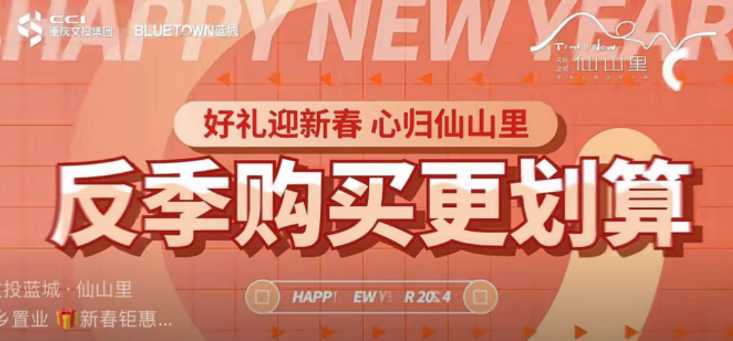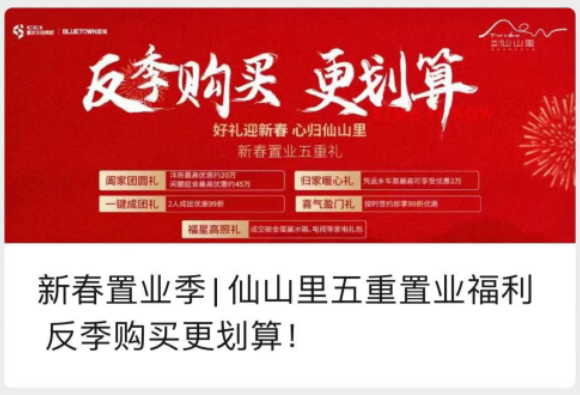 文投蓝城·仙山里项目结合新春置业特点,围绕折扣优惠利好、返乡置业话题、团购传播、购买激励等维度,策划“反季购买更划算,好礼迎新春心归仙山里”的春节促销活动,推出新春置业五重礼即“阖家团圆礼、归家暖心礼、一键成团礼、喜气盈门礼、福星高照礼”,依托项目微信公众号、微信视频号等自媒体平台,通过电子海报、推文、短视频等形式进行促销活动宣传,加大春节期间项目曝光度。