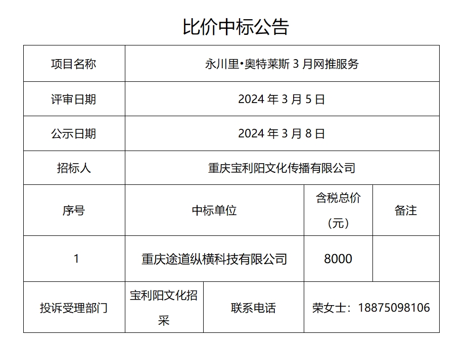永川里•奥特莱斯3月网推服务比价中标公告
