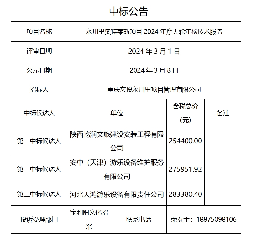 永川里奥特莱斯项目2024年摩天轮年检技术服务中标公告