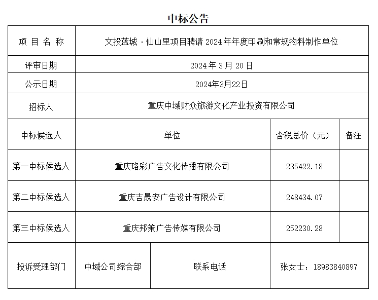 文投蓝城·仙山里项目聘请2024年年度印刷和常规物料制作单位中标结果